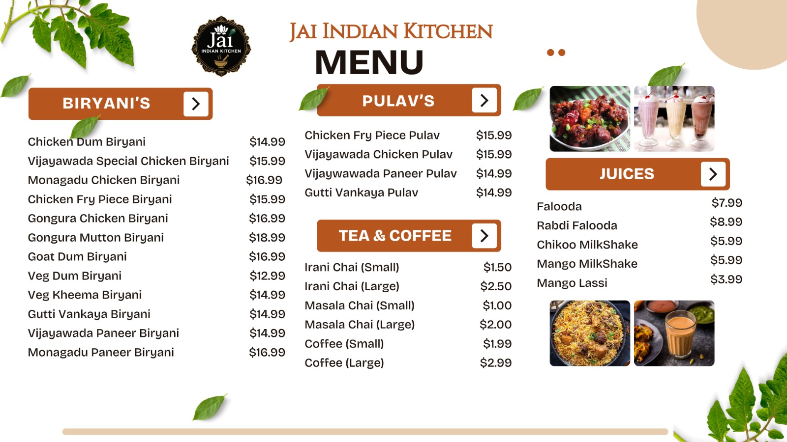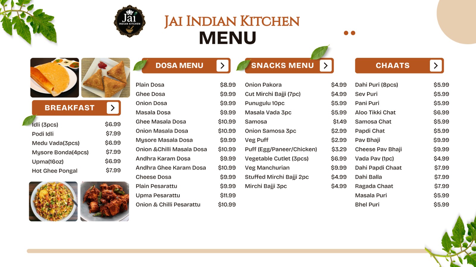 South & North Indian favorites — breakfast, dosa, chaats, biryani, pulav, juices. Dine-in • Takeout • Weekend breakfast.